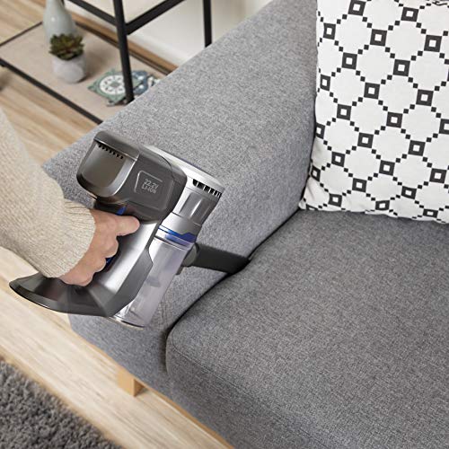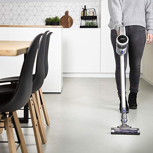 Geen gedoe met snoeren of stofzakken, maar geheel draadloos en makkelijk manoeuvreerbaar over harde vloeren en tapijt