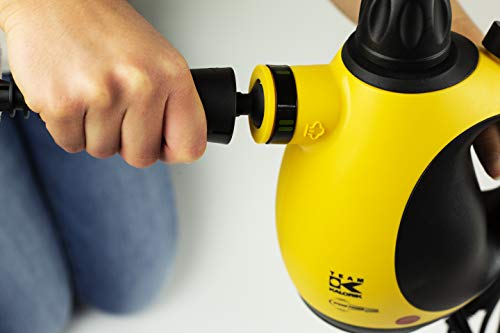 Stoomreiniger voor grondige dieptereiniging, ontsmetting en ontvetting, ideaal voor het reinigen van het huis (vensters, keuken, badkamer, houten vloeren) zonder reinigingsmiddelCompact en lichtgewicht concept, stoomknop op de handgreep voor een continue stoomstoot gedurende 8 tot 10 minuten voor snelle en efficiënte reiniging, controlelampje, veiligheidsdeksel 1000 W vermogen, 2,6 tot 3,2 bar stoomdruk, opwarmen in 3 tot 5 minuten voor efficiënt gebruik, inhoud: 250 ml water, aluminium ketel, stoomtemperatuur: 105 °CAccessoires: recht mondstuk (tapijt, vloeren, gordijnen), ruitenwisser (raamruiten, spiegel), zacht reinigingsdoek (houten en plateau), gebogen sproeikop (voor stoomp), kleine ronde borstel (harde oppervlakte), maatbeker, trechterinhoud: 1 team calorieënreiniger, borstels, reinigingsdoekje, gebogen sproeier, maatbeker, handleiding (mogelijk niet beschikbaar in het Nederlands). Gewicht: 1,85 kg, afmetingen: 25,9 x 24,1 x 15,5 cm, kleur: geel/zwart, TKG SFC 1005